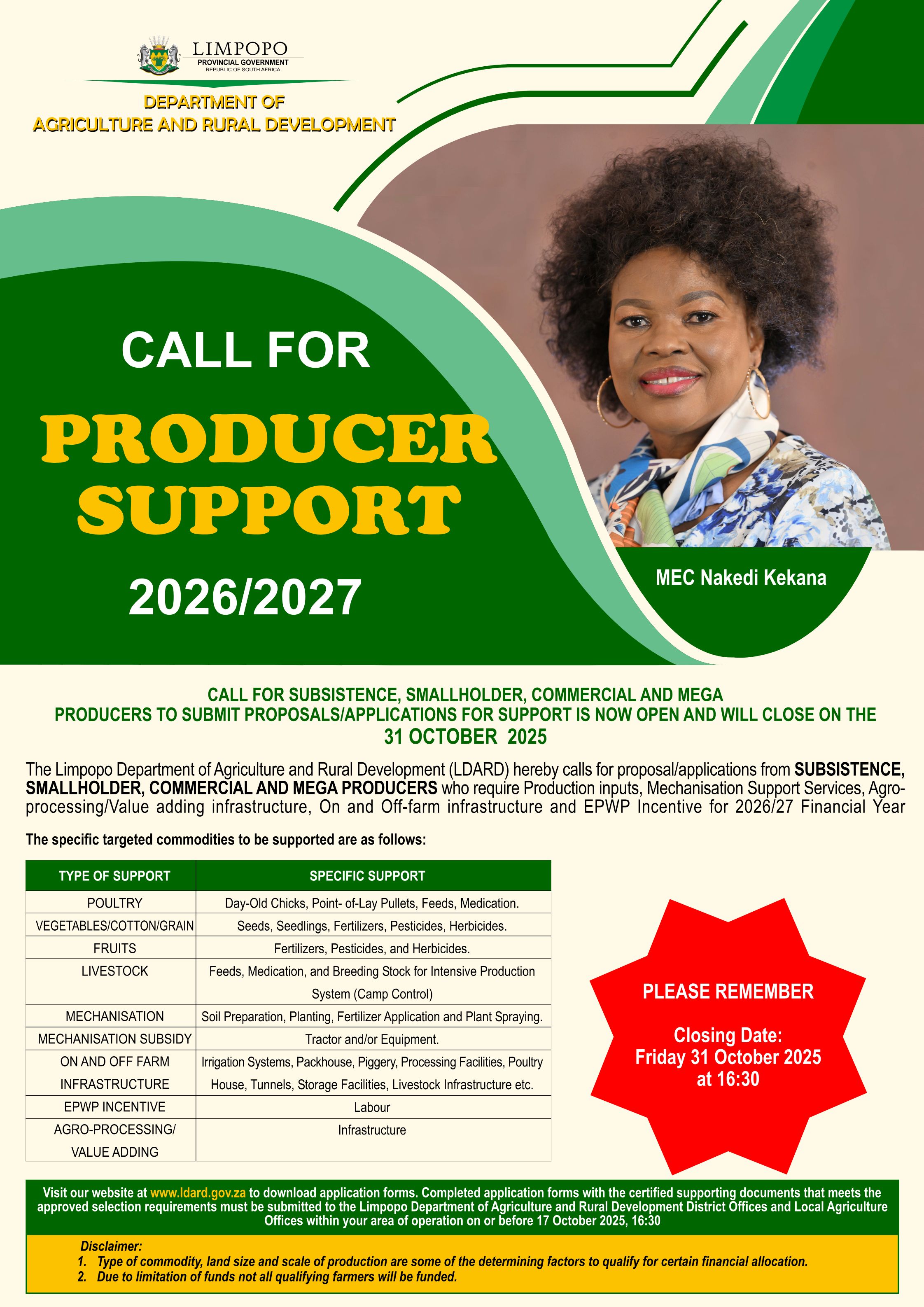 The Limpopo Department of Agriculture and Rural Development (LDARD) hereby calls for proposal/applications from SUBSISTENCE, SMALLHOLDER, COMMERCIAL AND MEGA PRODUCERS who require production inputs, infrastructure, EPWP Incentive and mechanisation support services for 2026/27 Financial Year.